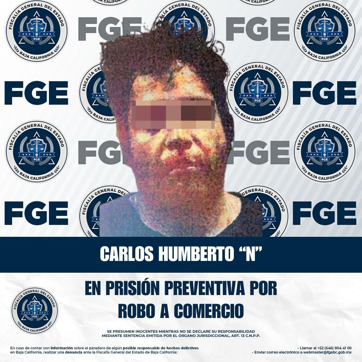 TIJUANA, BAJA CALIFORNIA. - La Fiscalía Regional de Tijuana obtuvo la medida cautelar de prisión preventiva justificada en contra de Carlos Humberto “N”, por su presunta responsabilidad en el delito de robo calificado a establecimiento comercial abierto al público.
