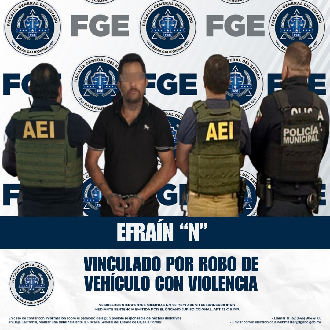 ENSENADA, BAJA CALIFORNIA. - La Fiscalía General del Estado cumplimentó una orden de aprehensión y obtuvo la vinculación a proceso en contra de Efraín “N” por el delito de robo de vehículo con violencia, como resultado de la investigación realizada en el municipio de Ensenada.