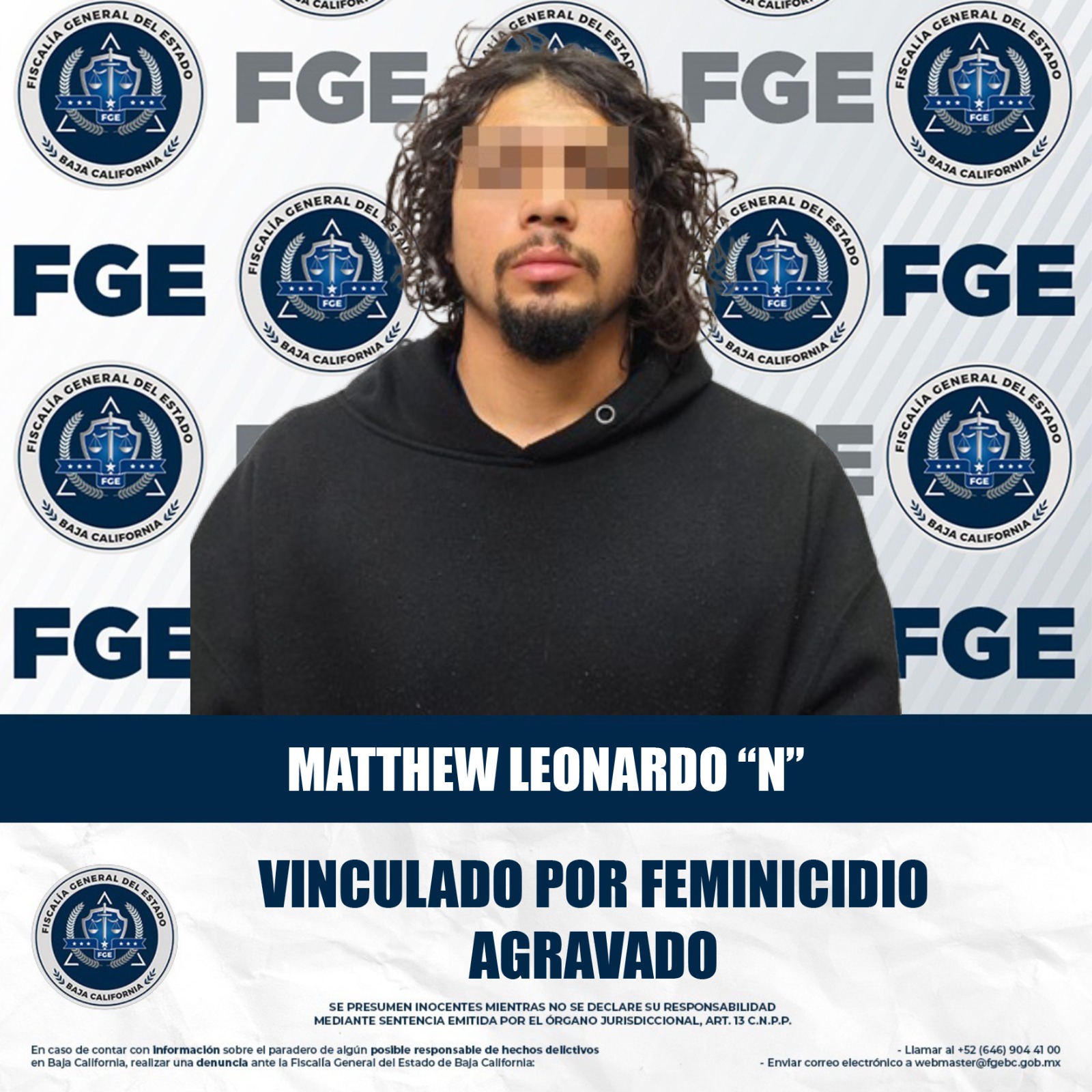 MEXICALI, BAJA CALIFORNIA. - La Fiscalía General del Estado (FGE), mediante el trabajo de la Fiscalía Especializada en Delitos Contra la Vida, obtuvo la vinculación a proceso de Matthew Leonardo “N”, presunto responsable del feminicidio agravado de una mujer, quien fuera su madre.
