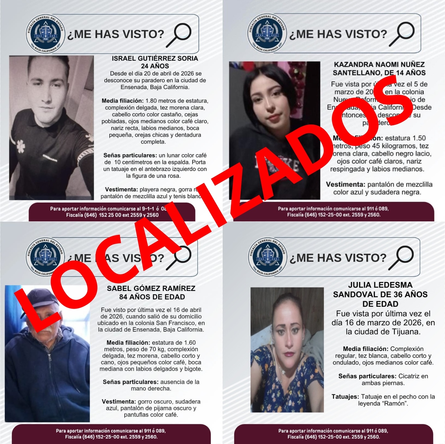 ENSENADA, BAJA CALIFORNIA. - La Fiscalía General del Estado, a través de la Unidad Especializada para la Investigación y Persecución de Delitos de Desaparición Forzada y Desaparición Cometida por Particulares, informó la localización de cuatro personas que contaban con reporte de desaparición en Ensenada, como resultado del trabajo de investigación realizado y del apoyo de la ciudadanía.