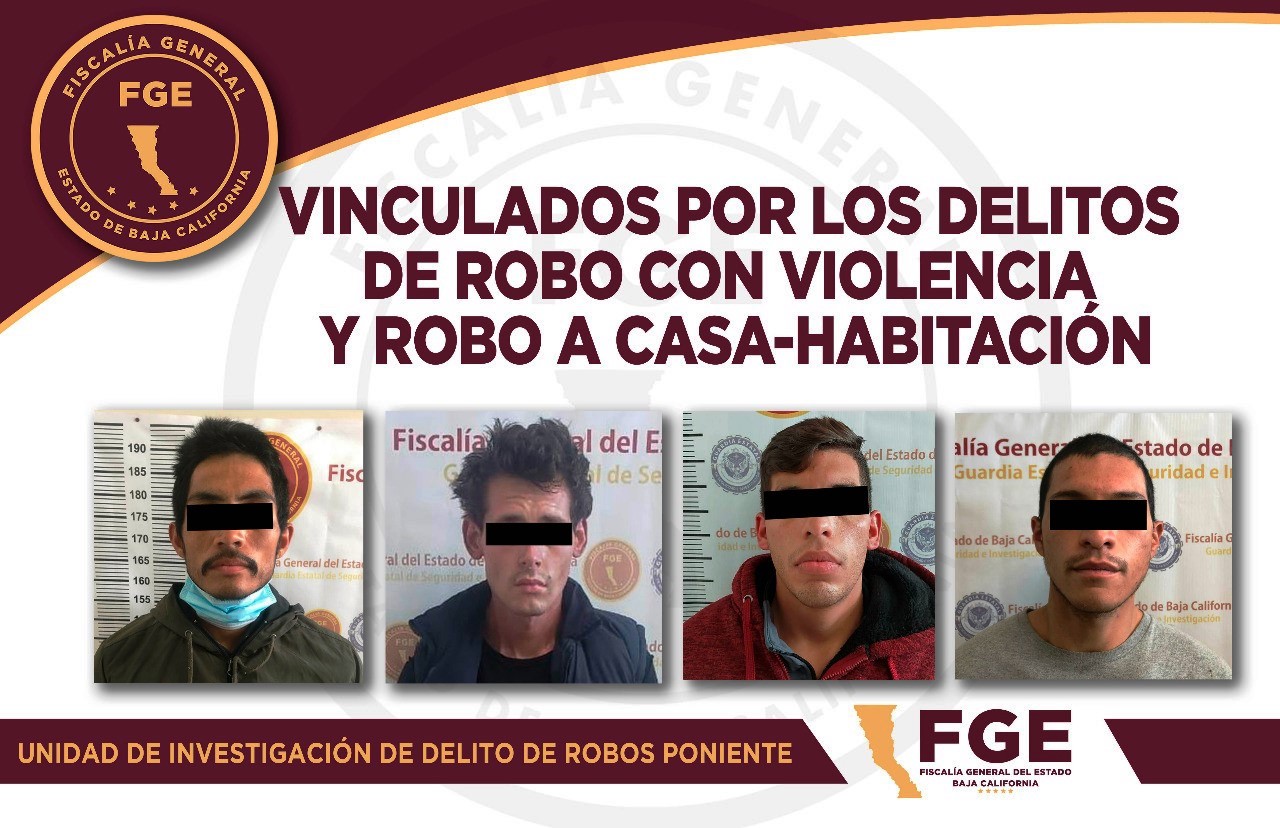 La Fiscalía Regional de Mexicali, obtuvo la vinculación a proceso de cuatro varones por el delito de robo con violencia calificado por haberse cometido en establecimiento comercial abierto al público y robo a casa-habitación, en audiencias por separado.