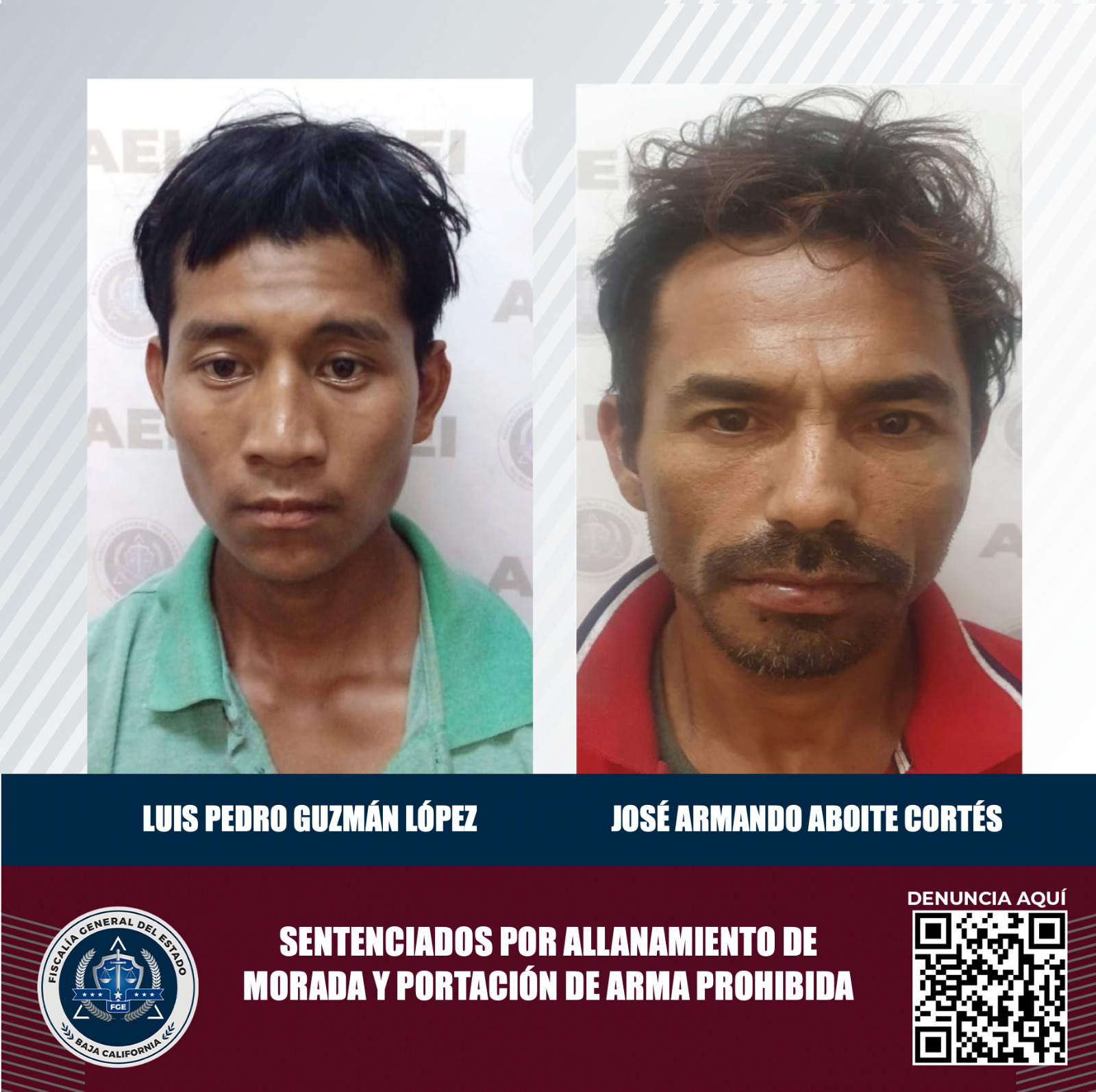 ENSENADA, B.C. La Fiscalía Regional de Ensenada logró, en casos distintos, sentencias condenatorias contra dos hombres que resultaron penalmente responsables de allanamiento de morada y portación de arma prohibida.