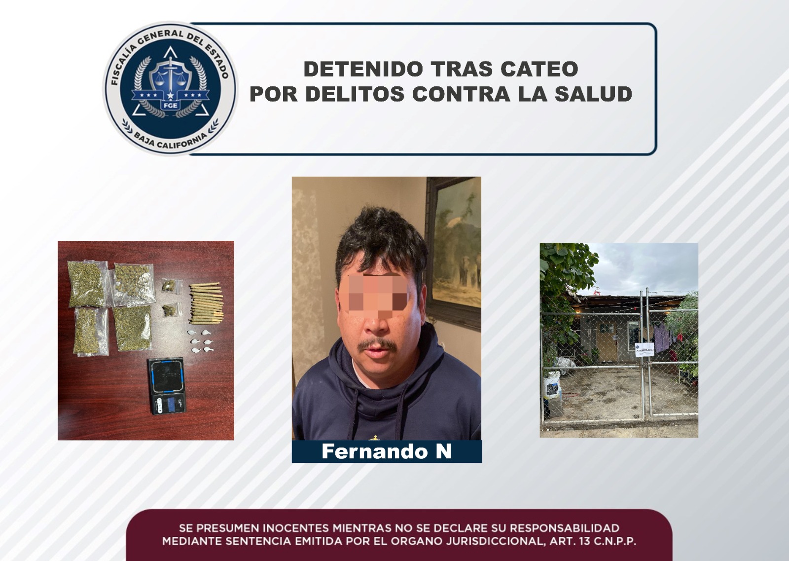 MEXICALI, B.C. En atención a denuncias anónimas, elementos de la Agencia Estatal de Investigación de la Fiscalía Especializada en Narcomenudeo, zona Mexicali, cumplimentaron una orden de cateo.