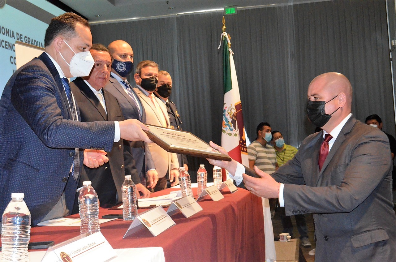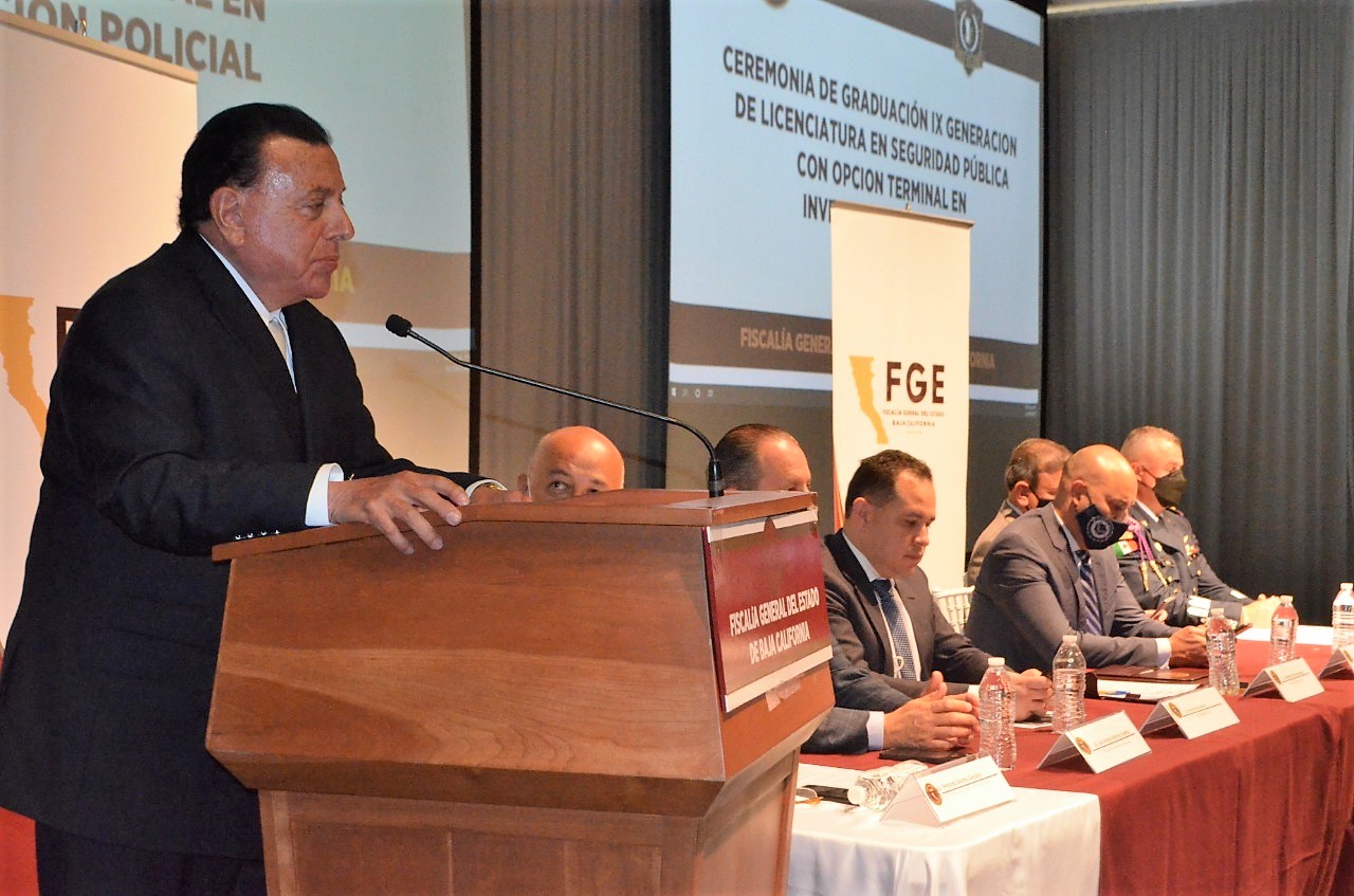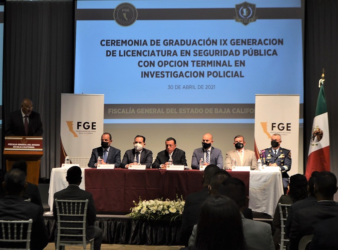 El Fiscal General del Estado, Lic. Juan Guillermo Ruiz Hernández, presidió la ceremonia de finalización de estudios de la novena generación de licenciados en seguridad pública con opción terminal en investigación policial, integrada por 60 elementos de corporaciones de seguridad pública municipales y estatales de Baja California.
