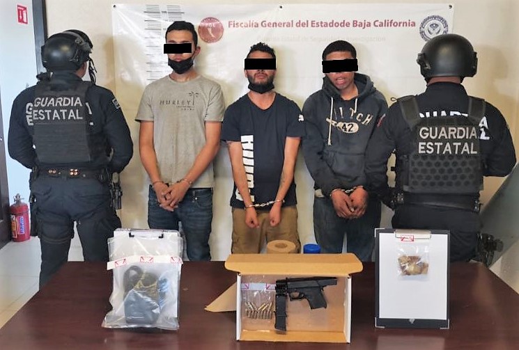 Elementos de la Fiscalía General del Estado (FGE), arrestaron a tres sujetos en posesión de arma de fuego y droga.