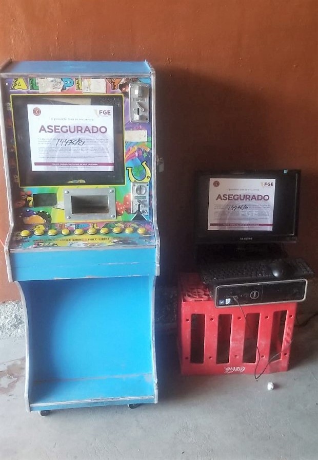 Continuando con las diligencias, en el puesto Michoacano ubicado en la avenida De Los Faisanes de la colonia El Cóndor, los agentes investigadores decomisaron una máquina de apuesta tipo casino y una computadora acondicionada.