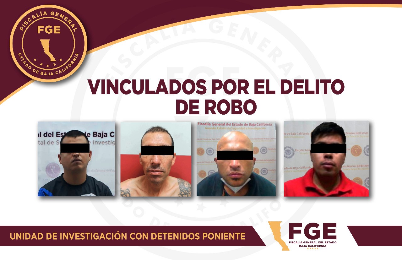 La Fiscalía Regional de Mexicali, a través de la Unidad de Investigación de robos Poniente, logró la vinculación en audiencias por separado de cuatro hombres relacionados en robo en sus diferentes modalidades.