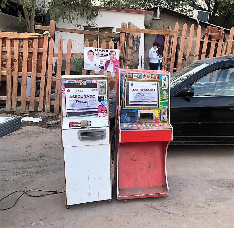Mientras que en el inmueble ubicado en la avenida Revolución de la colonia Simental, fueron decomisados dos máquinas tragamonedas utilizadas principalmente por menores de edad.