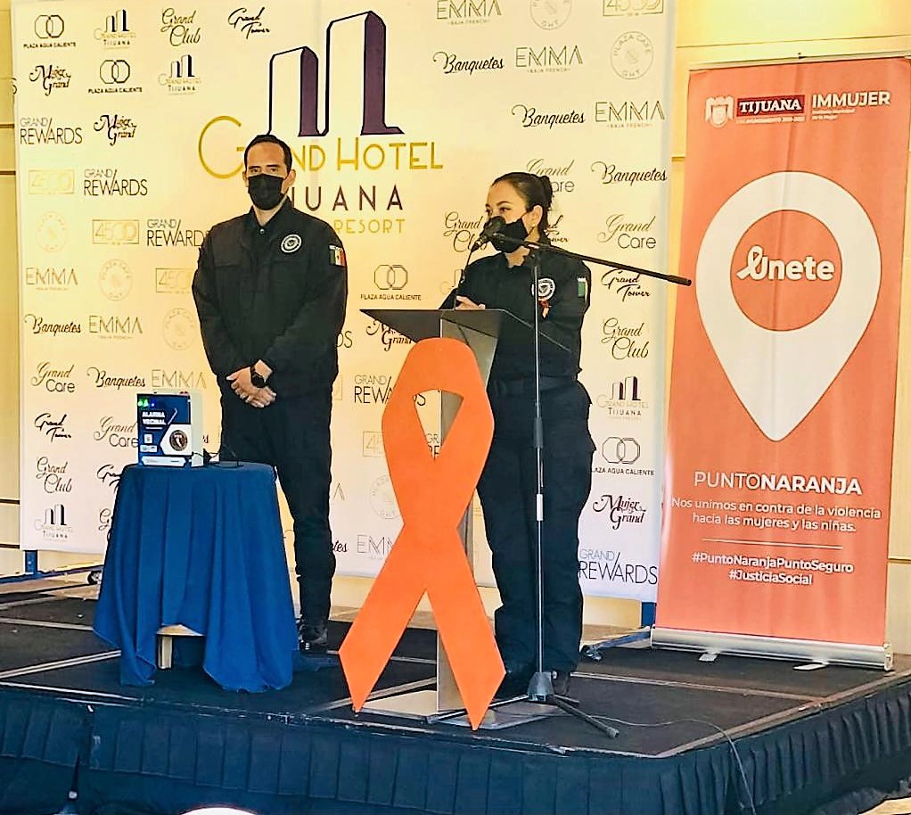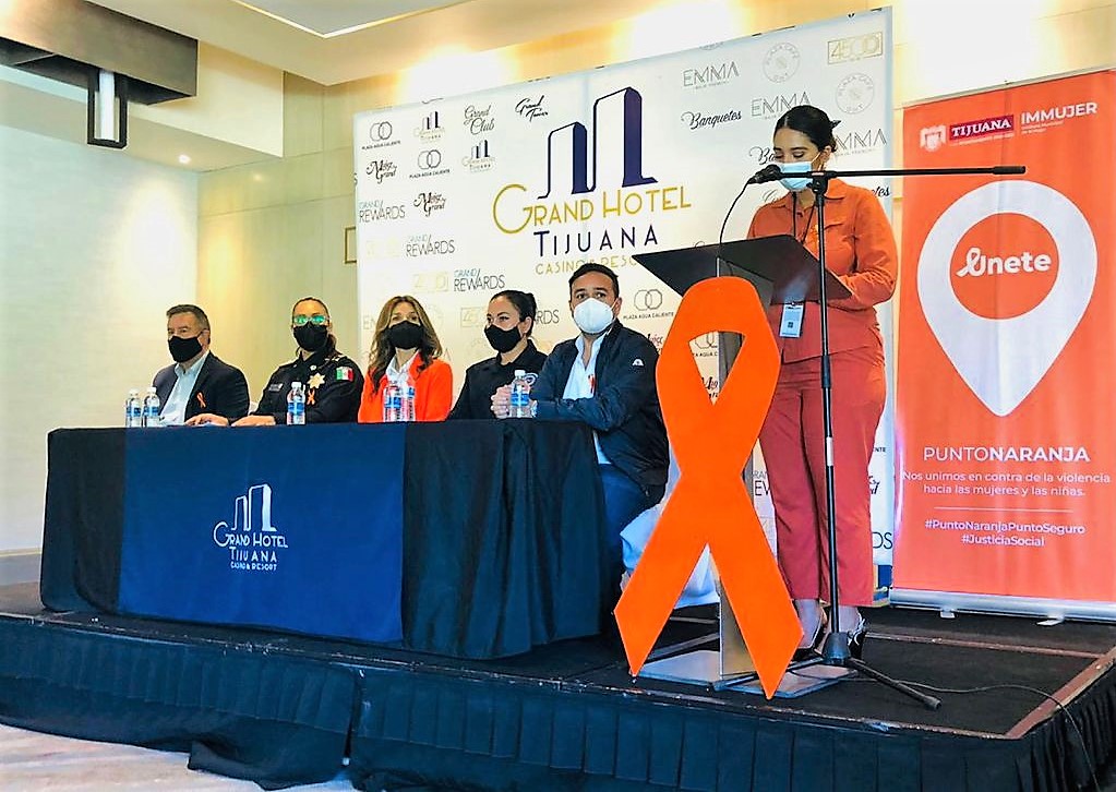 Durante el evento se informó el objetivo de programa de Punto Naranja, que consiste en que comercios y empresas de la ciudad funjan como un lugar de apoyo para orientar y canalizar a mujeres en situación de violencia, en coordinación con las instituciones de Gobierno.