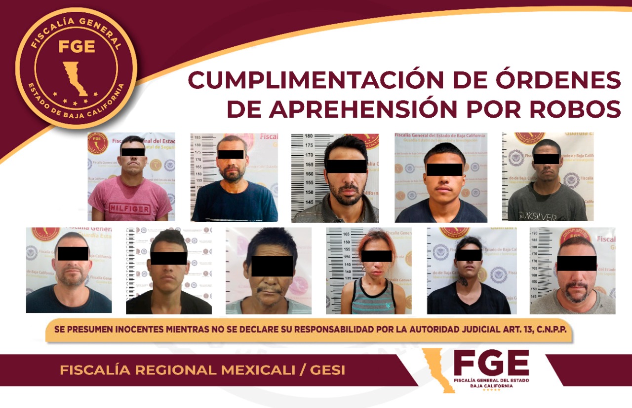 Elementos de la Fiscalía Regional de Mexicali cumplimentaron once órdenes de aprehensión en contra de igual número de individuos por los delitos de robo, en acciones por separado.