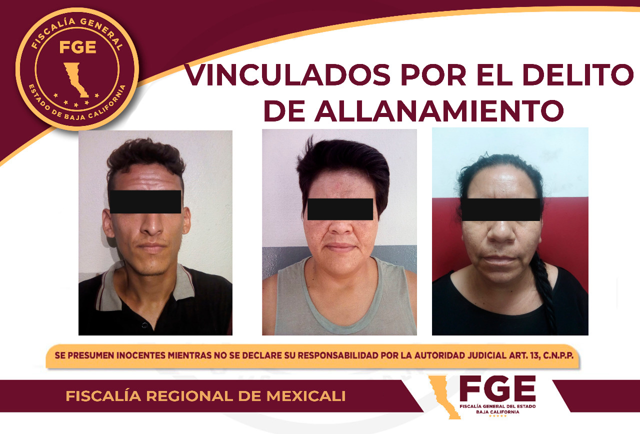 La Fiscalía Regional de Mexicali obtuvo vinculación a proceso de un varón y dos féminas por los delitos de Allanamiento, Allanamiento con Violencia y Amenazas, allanamiento y lesiones, durante audiencias por separado.