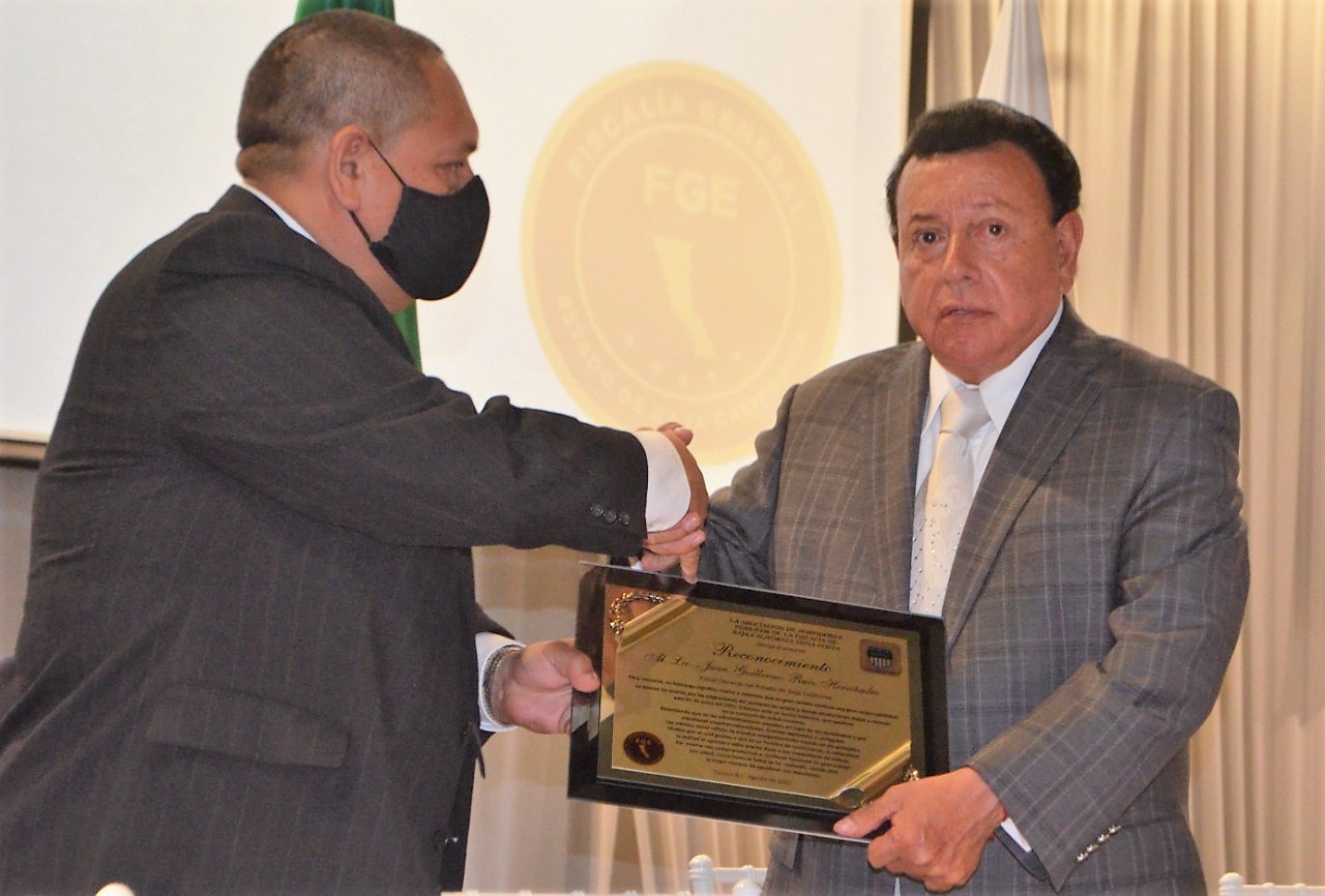 El licenciado Juan Guillermo Ruiz Hernández, recibió dos placas de reconocimiento por parte de los representantes de asociaciones de policías y servidores públicos, a nombre del personal que labora en la Fiscalía General del Estado (FGE).