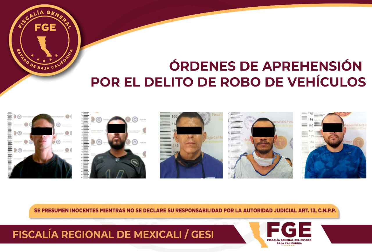 Elementos de la Fiscalía General del Estado (FGE), cumplimentaron cinco órdenes de aprehensión en contra de igual número de individuos, por los delitos de robo de vehículos.