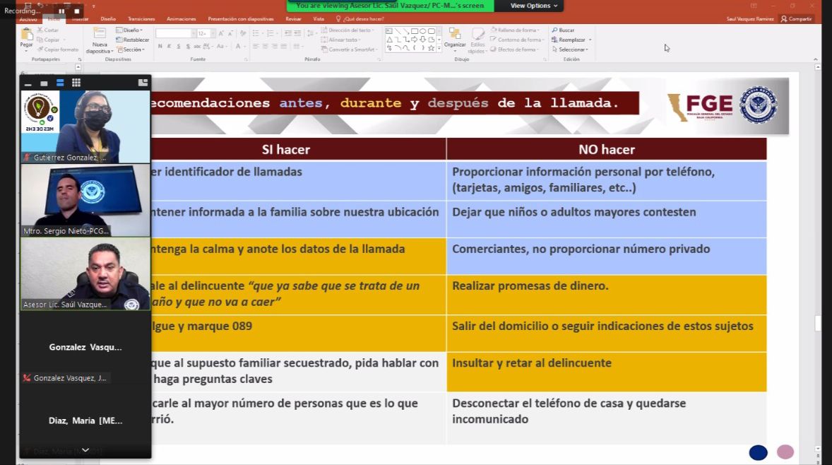 La Fiscalía General del Estado (FGE) imparte pláticas virtuales para difundir entre la ciudadanía el uso correcto del número de emergencias 9-1-1, y de denuncia anónima 089, así como prevenir diversos ilícitos.