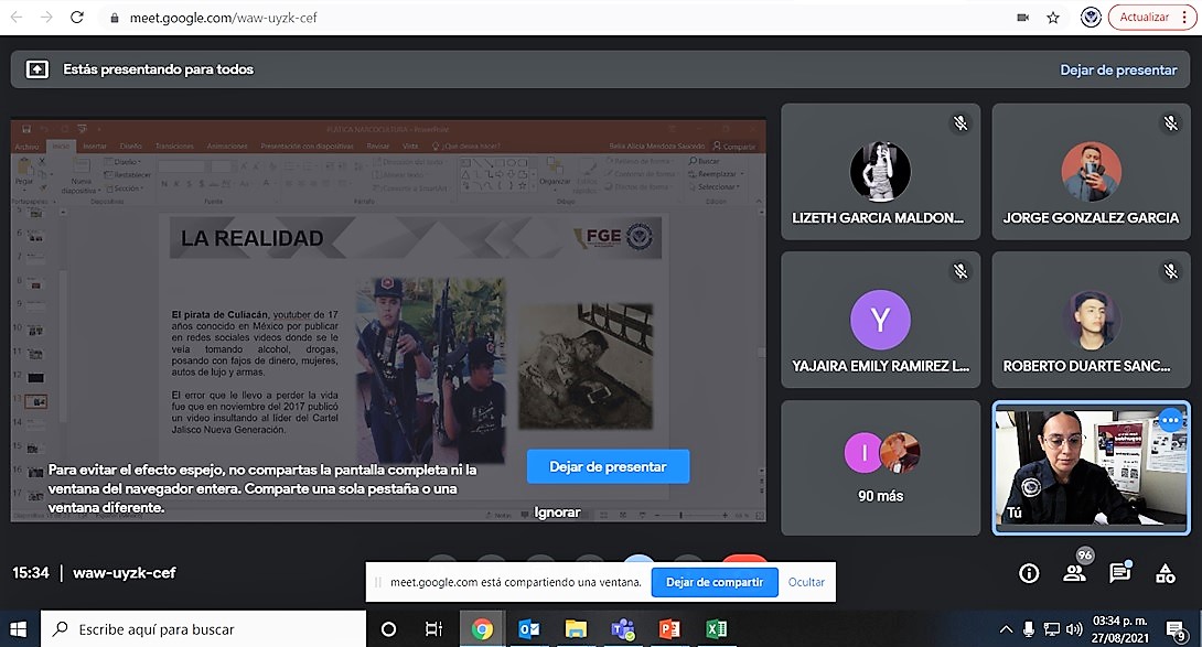 A los jóvenes se les proporcionó los antecedentes, conceptos, factores de riesgo y manifestaciones de la Narcocultura, organizaciones delictivas dedicadas al narcotráfico, destinos posibles de sus integrantes y marco jurídico que regula en la materia.