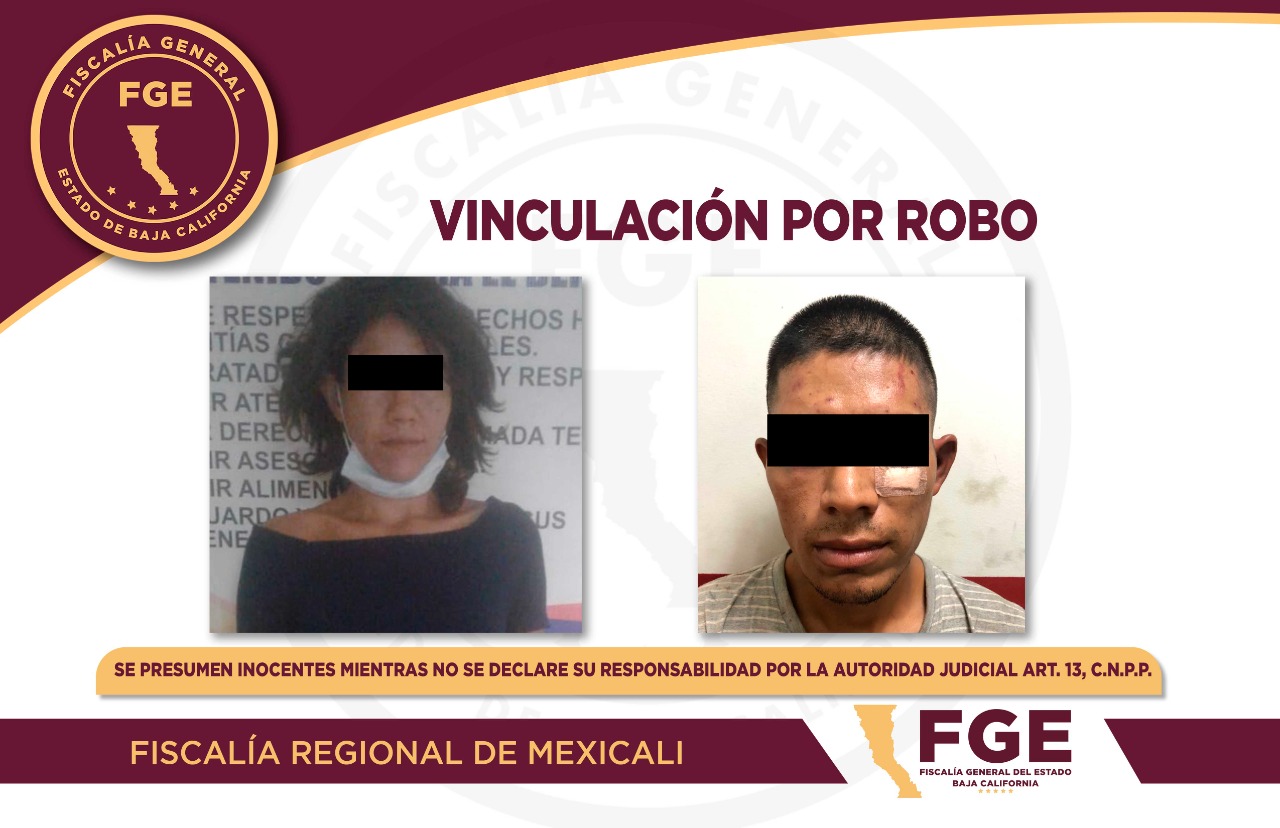 La Fiscalía Regional de Mexicali, a través de la Unidad de Investigación de Delitos con Detenido Poniente y de la Unidad Foránea de Guadalupe Victoria, logró vincular a proceso a dos personas relacionados en robos