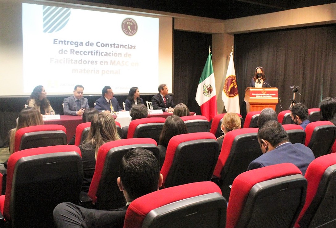 El fiscal general del Estado, Juan Guillermo Ruiz Hernández, entregó constancias de recertificación a ocho facilitadores del Sistema Estatal de Justicia Alternativa, esto tras cumplir con una capacitación de 100 horas, con base a los lineamientos de la Conferencia Nacional de Procuración de Justicia y con apego a lo establecido por la Ley Nacional de Mecanismos Alternativos de Solución de Controversias en Materia Penal.