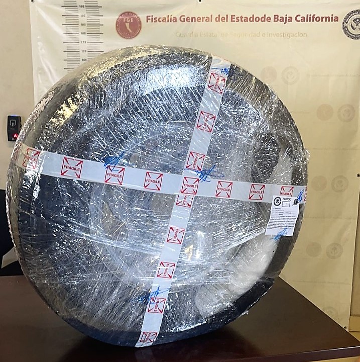 Al interior de la llanta se encontraron cinco bolsas de color transparente, las cuales contenían sustancia granulada al parecer metanfetamina dando un peso de 27.54 kilogramos.