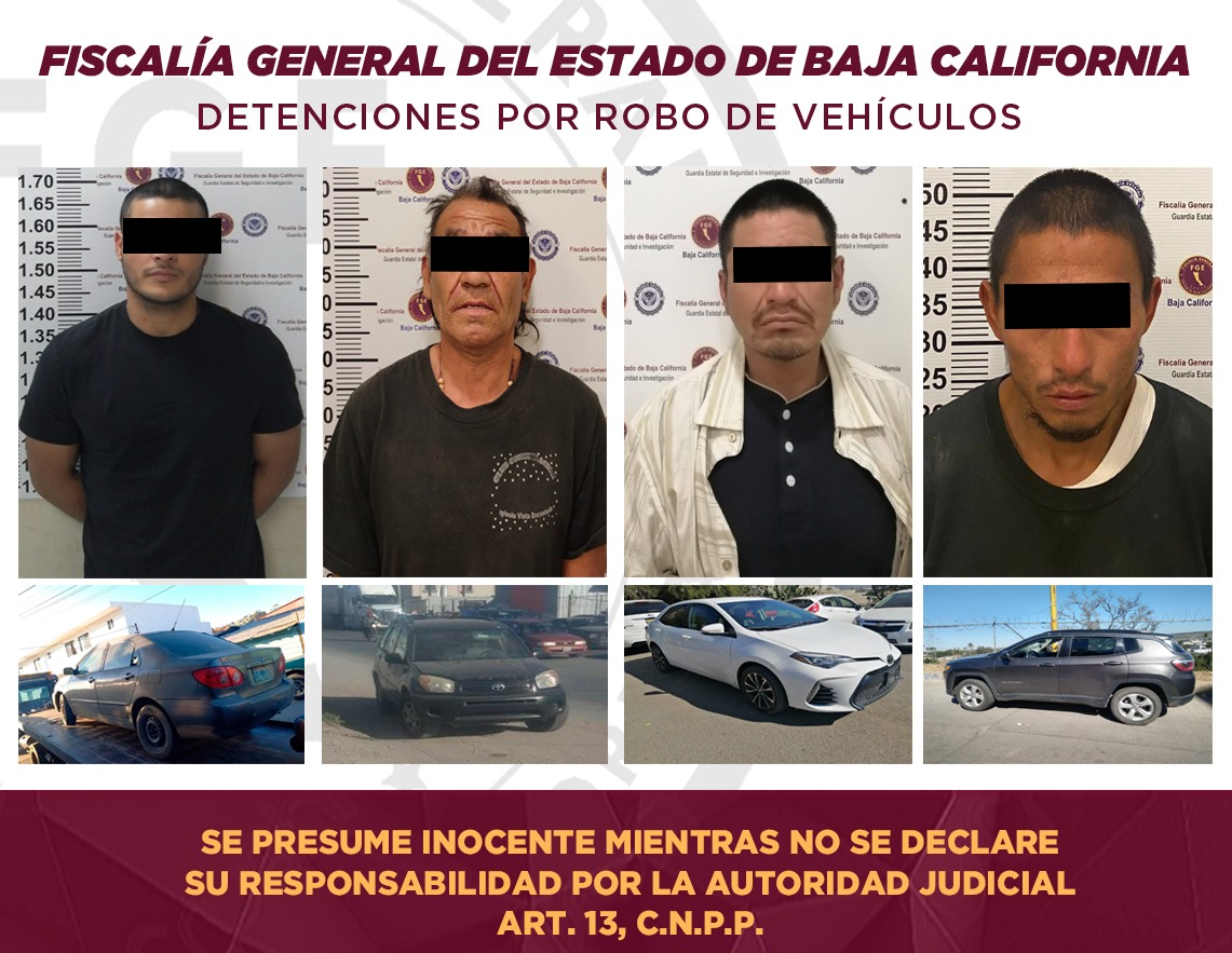 La Fiscalía General del Estado (FGE), informa la detención de cuatro personas, una de ellas por delito flagrante y tres al contar con orden de aprehensión, en todos los casos relacionados al robo de vehículos, además fueron recuperadas siete unidades que contaban con reporte de robo.