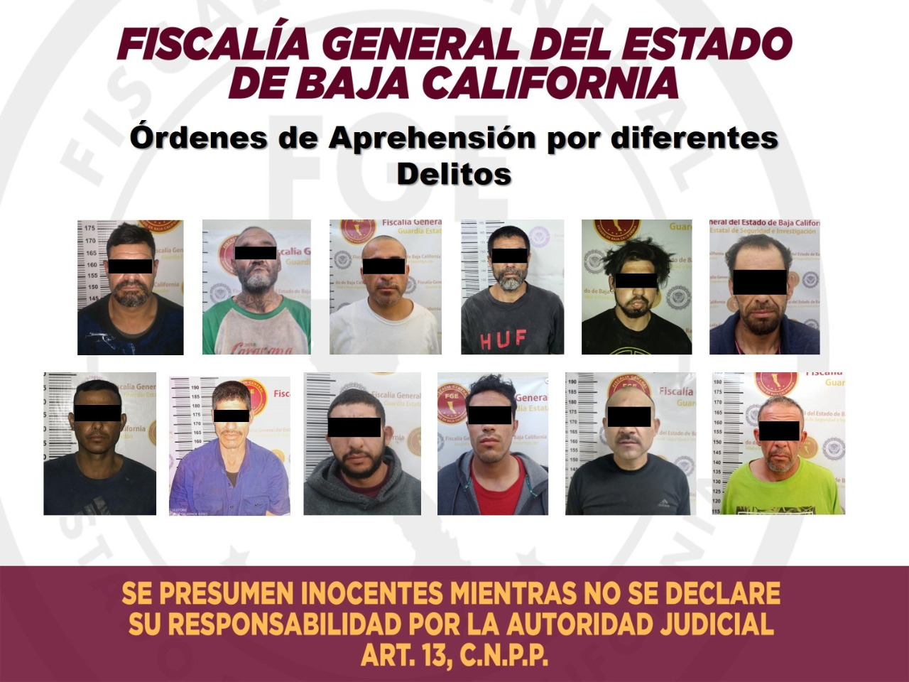 Dando seguimiento a las carpetas de investigación, elementos de la Fiscalía Regional de Mexicali lograron el aseguramiento de 13 sujetos prófugos de la justicia por diferentes delitos.