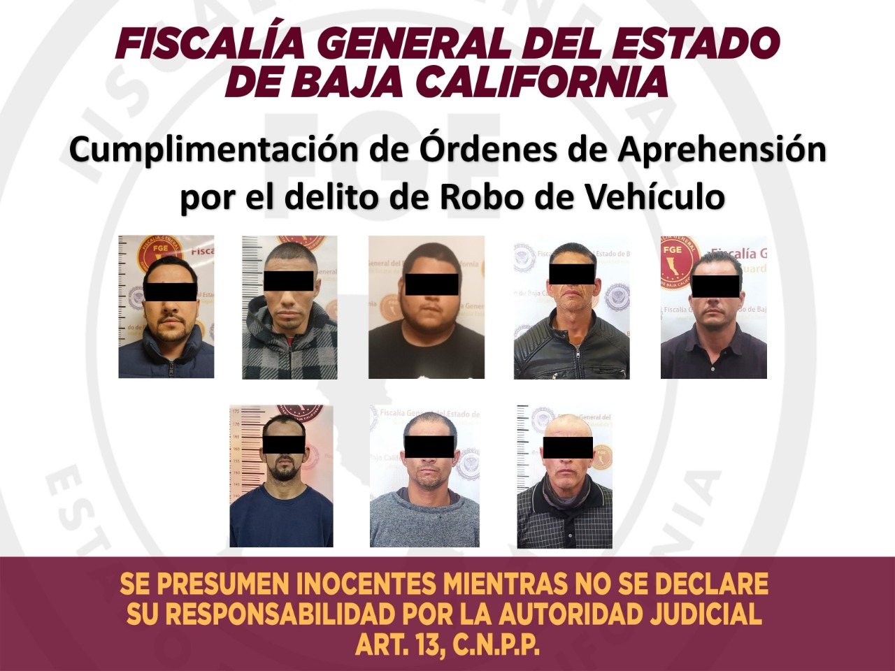 Como parte de la estrategia integral contra el delito de robo de vehículo, elementos de la Fiscalía General del Estado (FGE), detuvieron a ocho sujetos que contaban con mandatos judiciales en su contra.