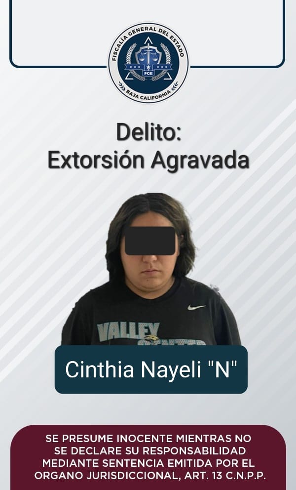 La Fiscalía Regional de Playas de Rosarito, a través de la Agencia Estatal de Investigación, cumplimentó la orden de aprehensión en contra de una mujer por el delito de extorsión agravada, por hechos denunciados en marzo del año en curso en perjuicio de un menor de edad.