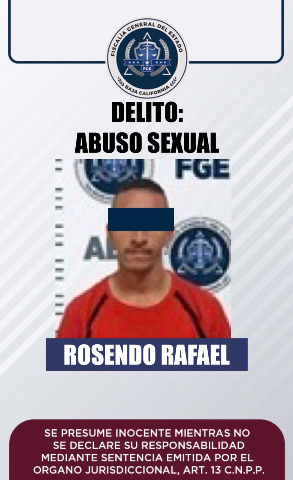 La Fiscalía General del Estado (FGE), capturó a Rosendo Rafael “N”, quien contaba con una orden de aprehensión por su presunta responsabilidad en el delito de abuso sexual agravado por razón de parentesco.