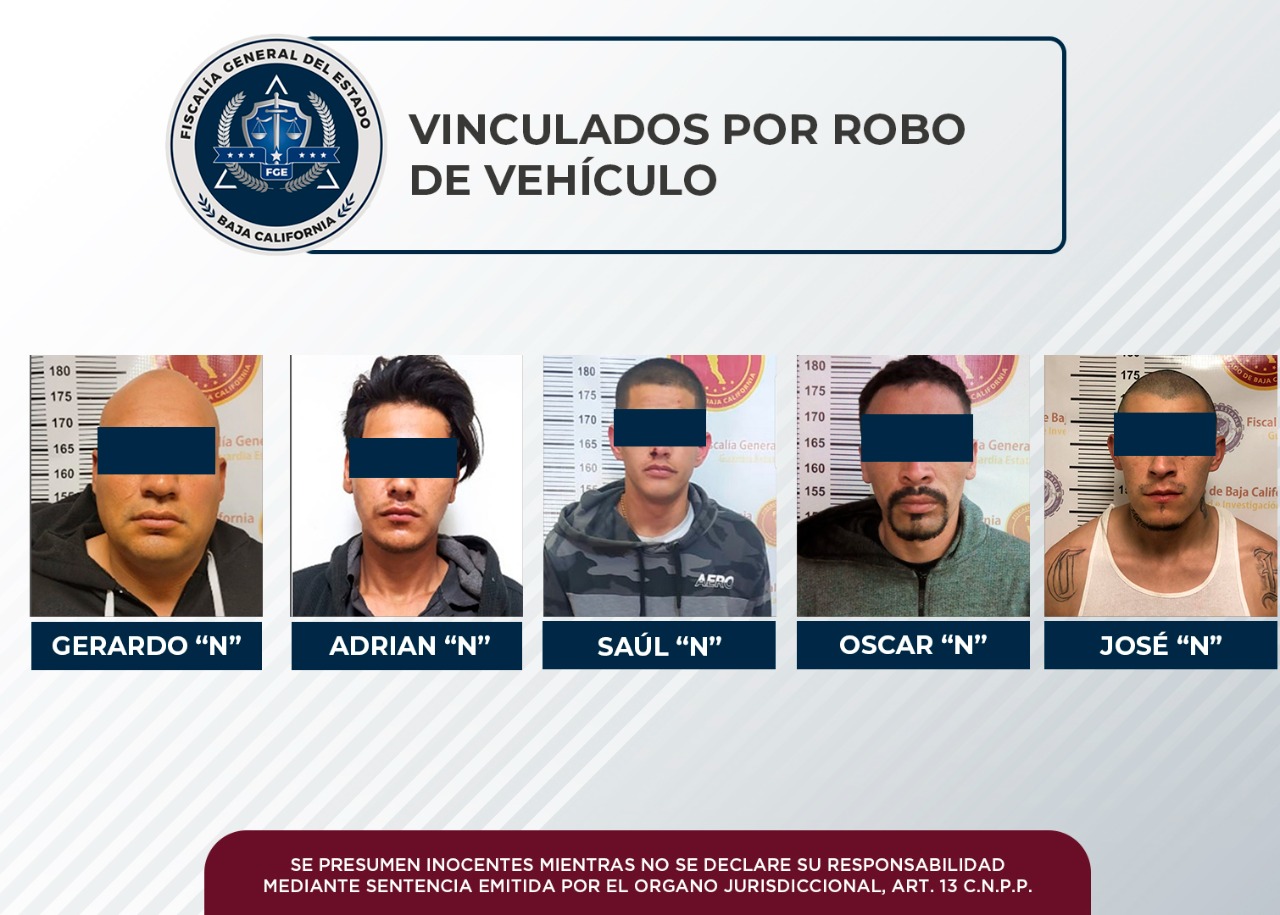 Cinco hombres relacionados en el delito de robo de vehículos, fueron vinculados a proceso con base a los elementos de prueba presentados ante el Juez, por la Fiscalía Regional de Mexicali a través de las Unidad de Investigación de Robo de Vehículos.