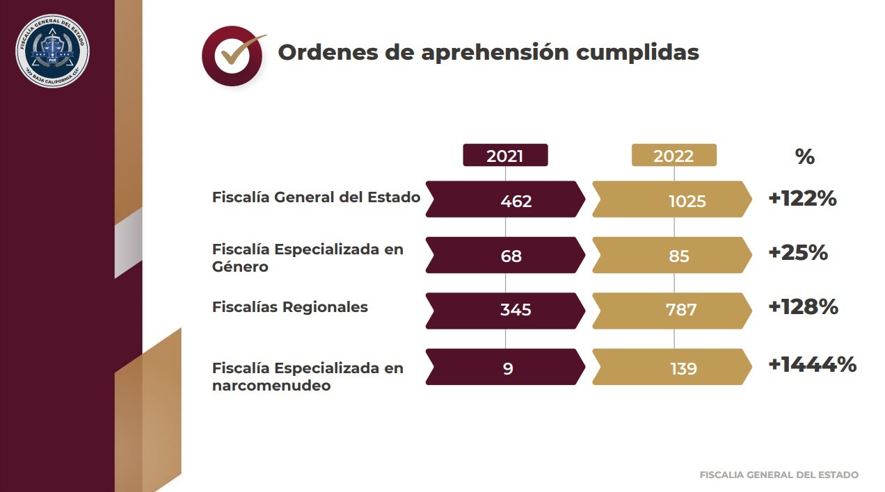 De igual manera las Fiscalías Regionales de la entidad, lograron un incremento de 128 por ciento en el número de órdenes cumplimentadas, pasando de 345 detenciones en el 2021 a 787 en el primer trimestre del 2022.