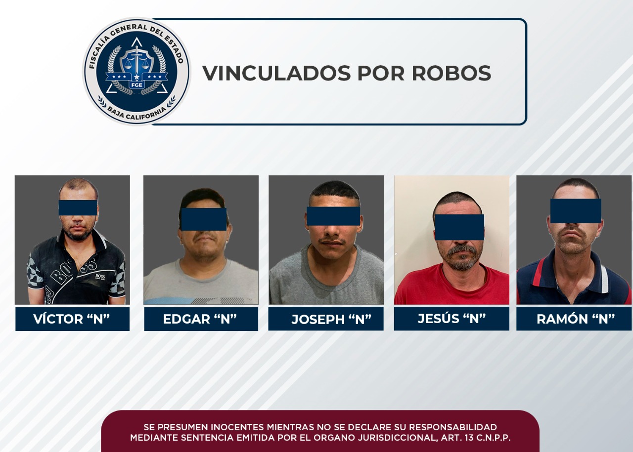 Cinco hombres relacionados en robos fueron vinculados a proceso por la Fiscalía Regional de Mexicali, a través de la Unidad de Investigación de Robos Poniente y las Unidades de Investigación con Detenidos Poniente y Oriente.