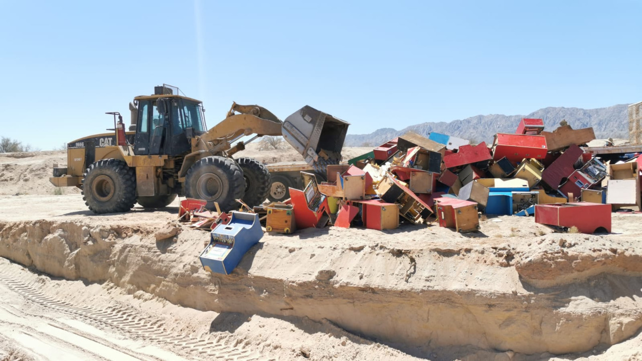 La Fiscalía Regional aseguró un total de 110 máquinas tipo casino y la Fiscalía Especializada en Narcomenudeo 5, mismas que fueron trituradas con maquinaria pesada para su inhabilitación total.
