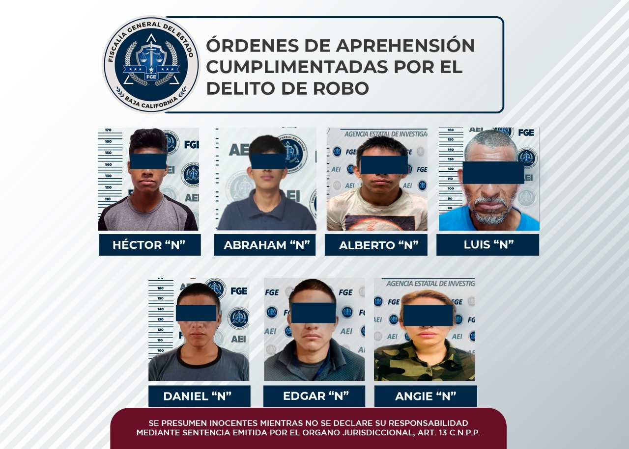 Elementos de la Fiscalía Regional de Mexicali, cumplimentaron ocho órdenes de aprehensión en contra de igual número de individuos, por los delitos de robo en sus diferentes modalidades y allanamiento de morada.