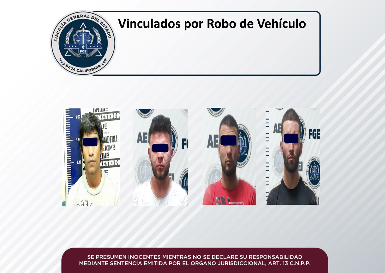 La Fiscalía Regional de Mexicali, a través de la Unidad de Investigación de Robo de Vehículos y la Unidad de Investigación Foránea de San Felipe, logró vincular a cuatro hombres relacionados en el delito de robo de vehículos en sus diferentes modalidades.
