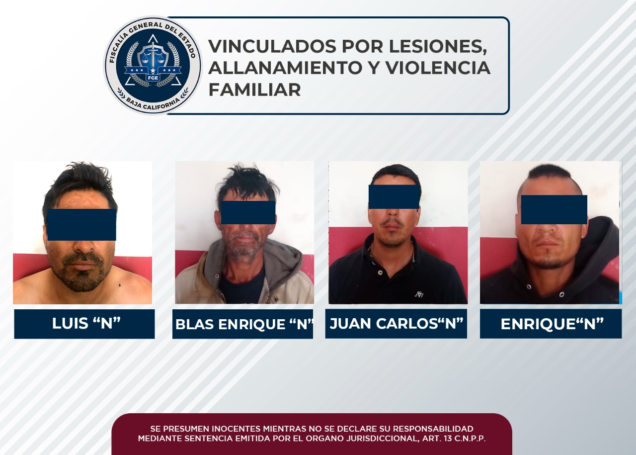 La Fiscalía Regional de Mexicali, a través de la Unidad de investigación de Delitos con Detenidos Poniente, logró con base a las pruebas y argumentos presentados ante el Juez, la vinculación a proceso de 4 hombres por el delito de violencia familiar, lesiones calificadas y allanamiento.