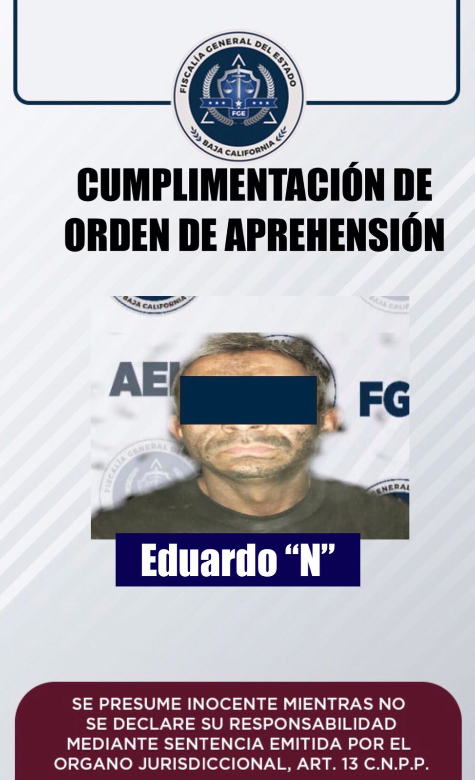 La Fiscalía General del Estado a través de Agentes Estatales de Investigación adscritos a la Fiscalía Regional zona Tecate, lograron la captura de Eduardo “N”, quien contaba con una orden de aprehensión por su presunta responsabilidad en el delito de violencia familiar y lesiones.