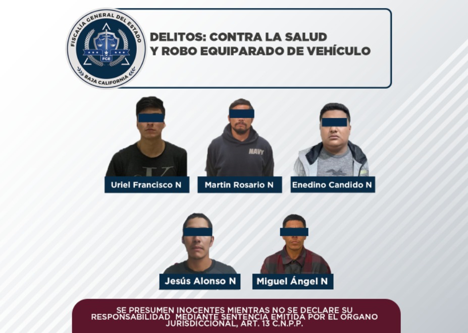 Elementos de la Agencia Estatal de Investigación (AEI) de la Fiscalía General del Estado, asignados a la Zona Tijuana, cumplimentaron cinco órdenes de aprehensión por delitos contra la salud y robo equiparado de vehículo.