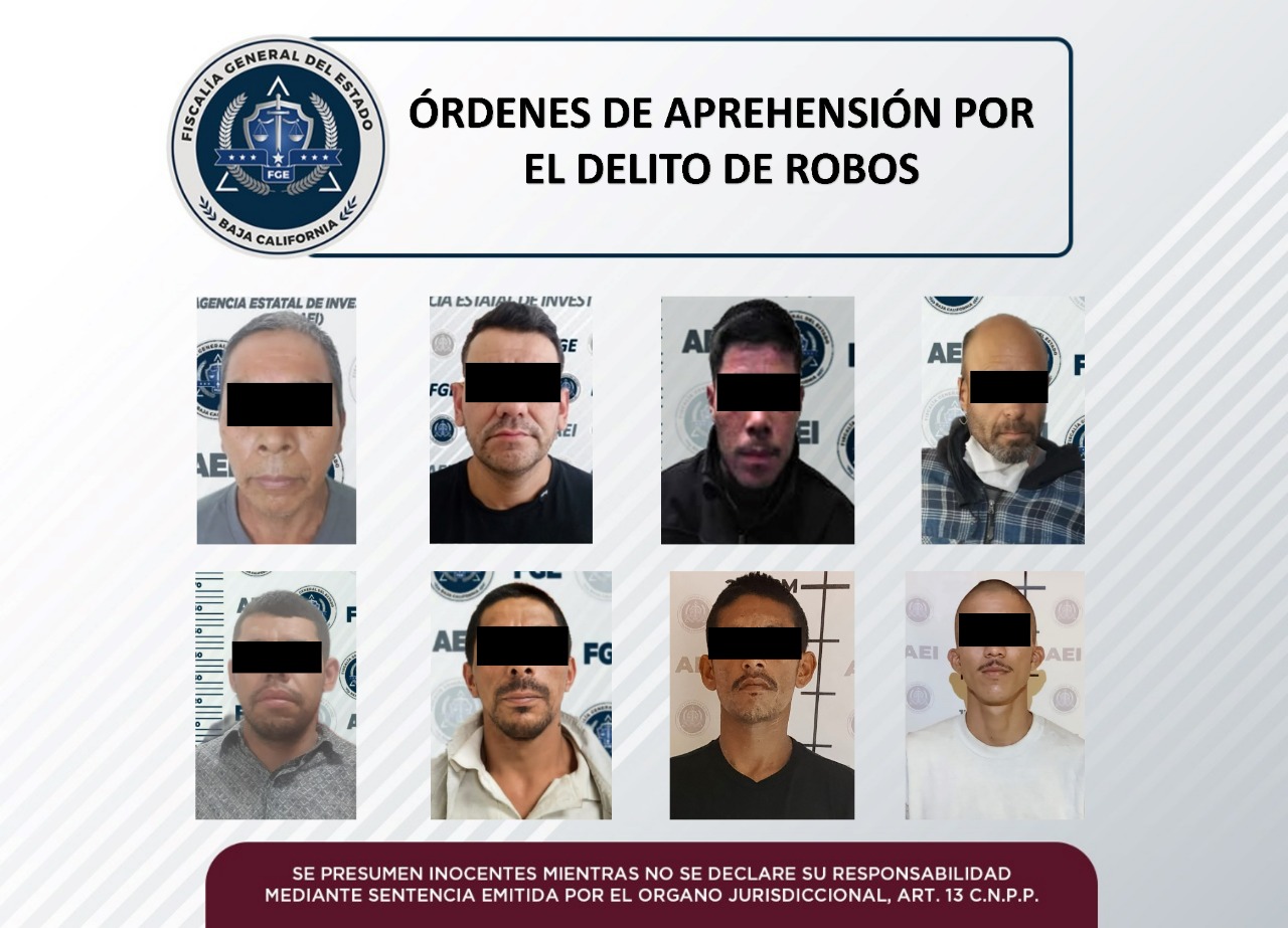 Elementos de la Fiscalía Regional de Mexicali, cumplimentaron ocho órdenes de aprehensión en contra de igual número de individuos, por los delitos de robo en sus diferentes modalidades y allanamiento de morada.