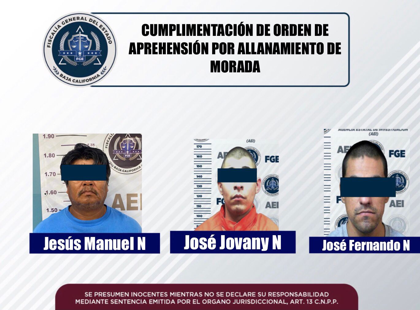 Elementos de la Fiscalía Regional de Mexicali, cumplimentaron tres órdenes de aprehensión en contra de igual número de individuos, por los delitos de allanamiento de morada.