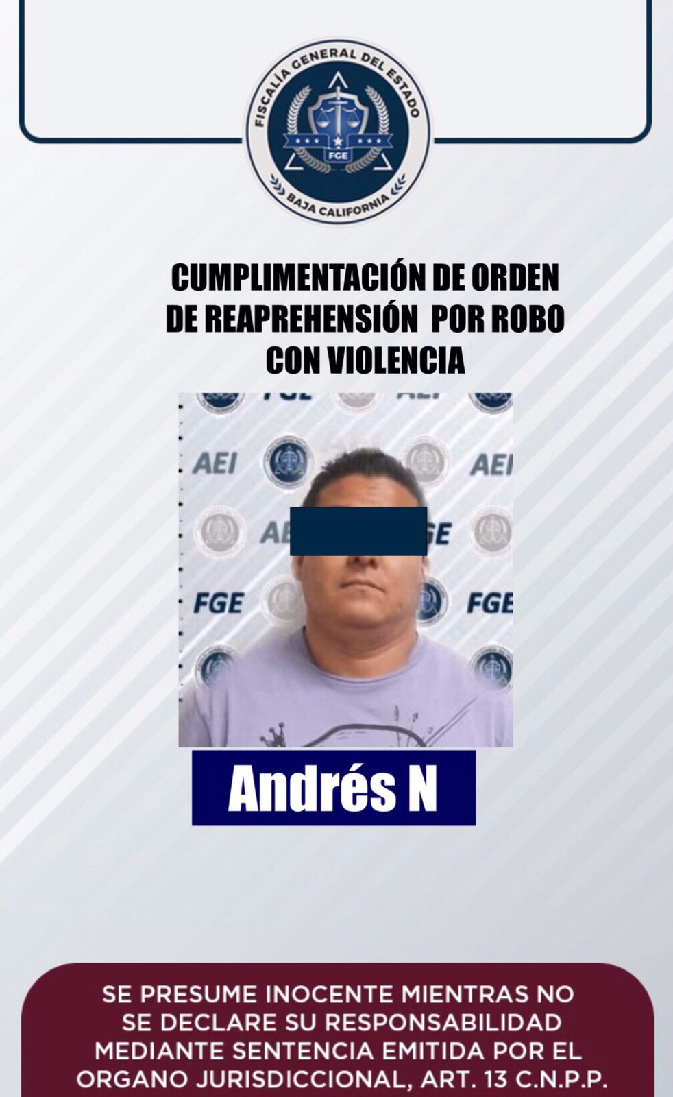 Elementos de la Fiscalía Regional de Mexicali, cumplimentaron una orden de reaprehensión en contra de Andrés “N”, por el delito de robo con violencia a establecimiento comercial.