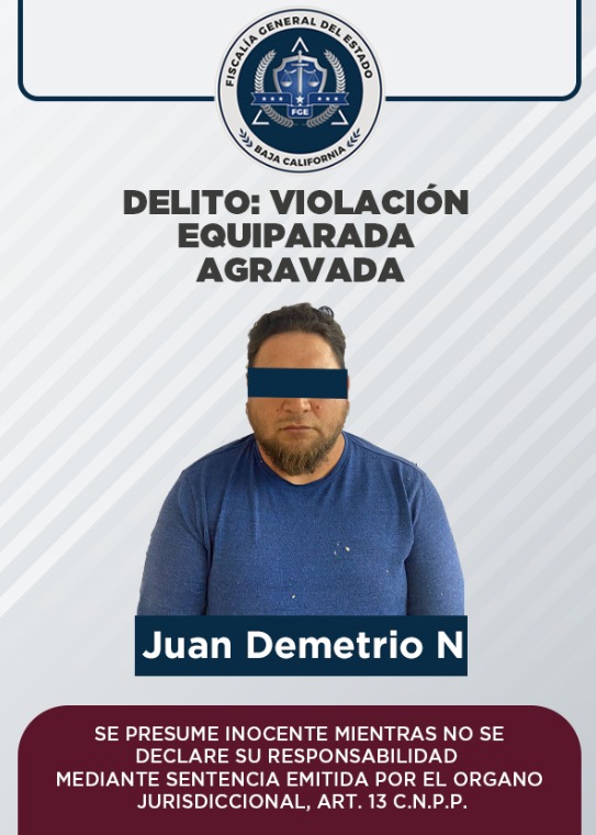 Elementos de la Agencia Estatal de Investigación (AEI) de la Fiscalía General de Baja California, lograron la detención de Juan Demetrio “N”, quien contaba con una orden de aprehensión vigente por violación equiparada agravada, en el vecino Estado de Sonora.