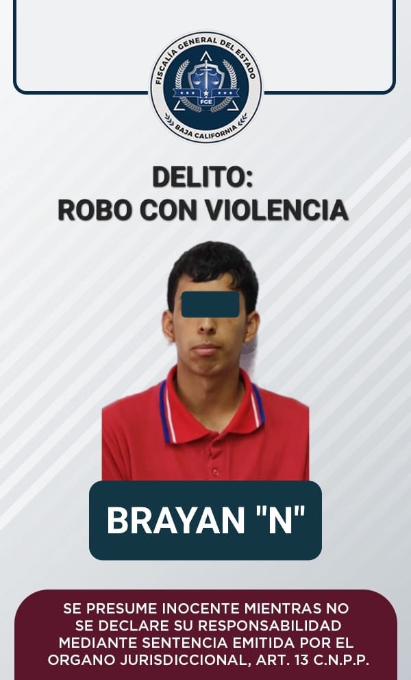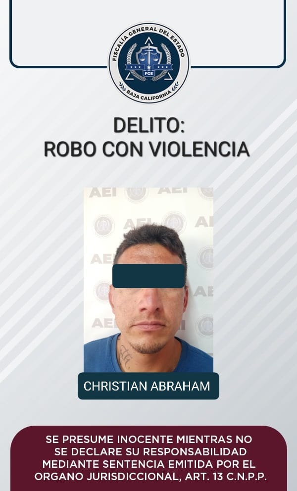 La Fiscalía Regional de Ensenada, a través de la Unidad de Investigación de Robos, logró la vinculación a proceso de un presunto asaltante identificado como Christian Abraham “N”, tras establecer su presunta participación en el robo a mano armada sucedido en un comercio de la colonia Cuauhtémoc.