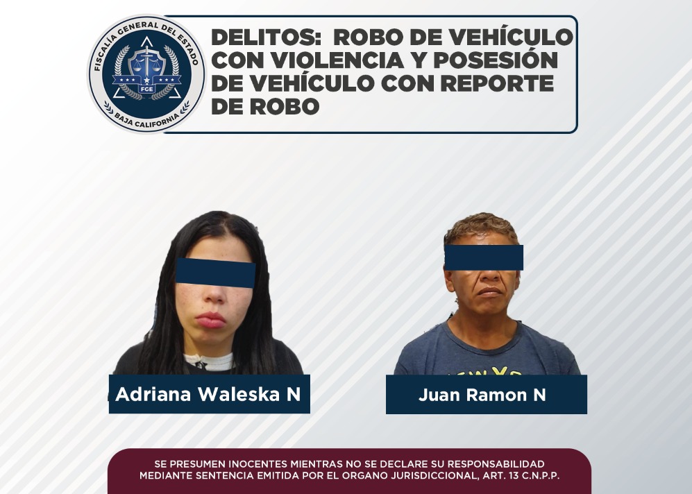 La Fiscalía General del Estado (FGE), a través de la Agencia Estatal de Investigación (AEI), cumplimentó orden de aprehensión a Adriana Waleska “N” por el delito de robo de vehículo con violencia, y a Juan Ramón “N”, por posesión de vehículo con reporte de robo.