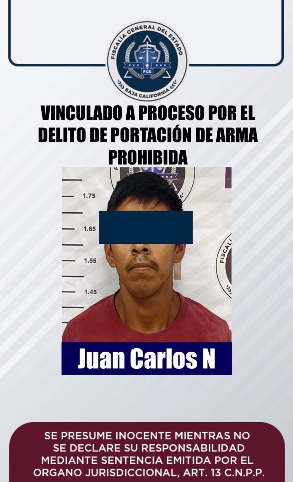 La Fiscalía Regional de Mexicali a través de la Unidad de Investigación Foránea San Felipe, logró la vinculación a proceso de Juan Carlos “N” alias “El Obscuro”, por el delito de Portación de Arma Prohibida.