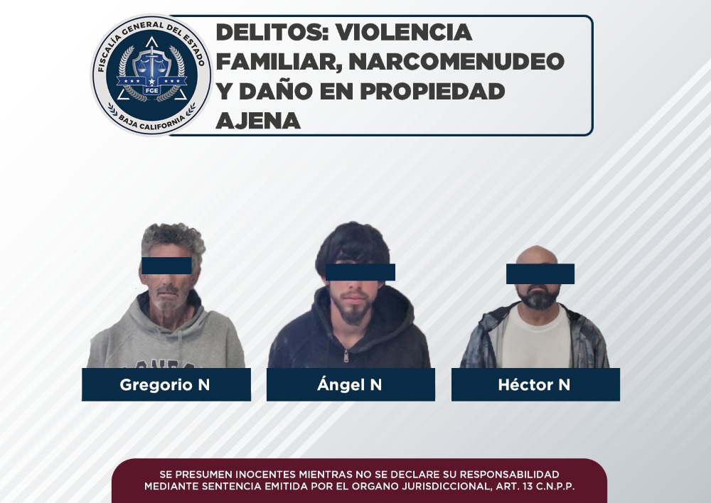 La Fiscalía Regional de Tecate informa sobre la cumplimentación de tres órdenes de aprehensión por los delitos de violencia familiar, narcomenudeo y daño en propiedad ajena.