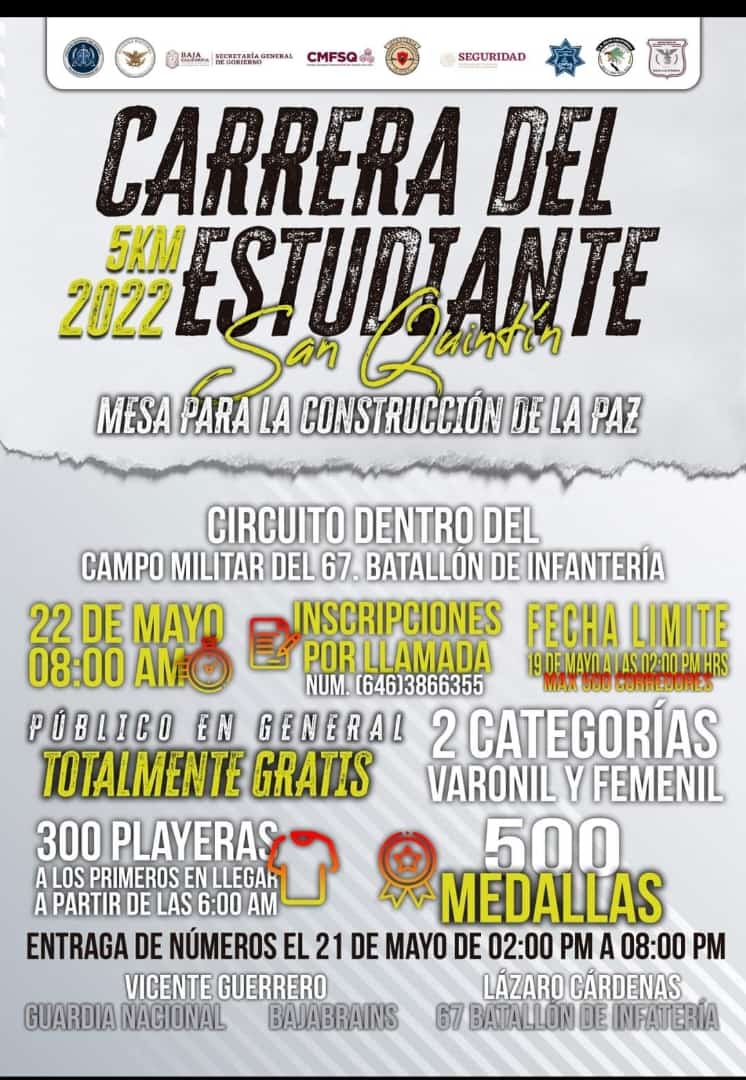 Autoridades que forman parte de la Mesa para la Construcción de la Paz en San Quintín, convocan a participar en la Carrera del Estudiante, que se llevará a cabo el próximo 22 de mayo.
