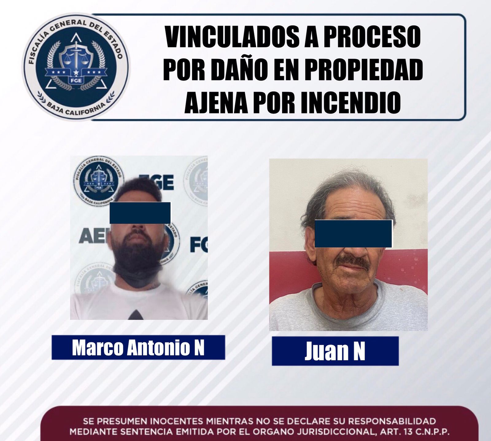 La Fiscalía Regional de Mexicali, a través de las acciones realizadas por la Unidad de Investigación de Delitos contra el Patrimonio y la Unidad con Detenidos Poniente, logró la vinculación a proceso de dos sujetos por el delito de daño en propiedad ajena por incendio, en distintos casos.