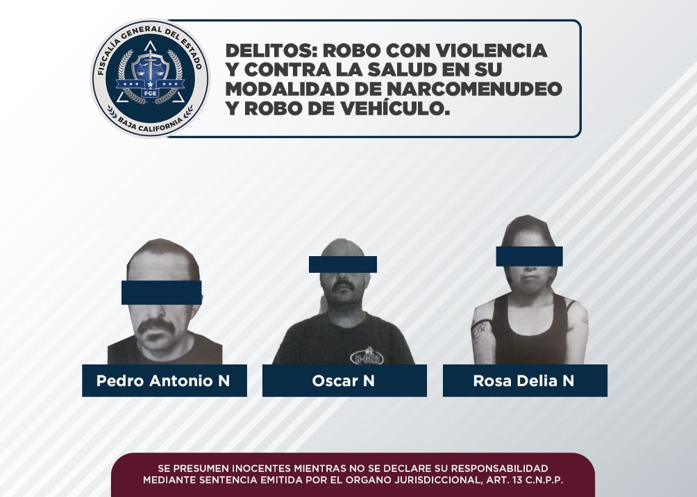 La Fiscalía Regional de Tecate, a través de las pruebas presentadas por agentes del Ministerio Público ante el Juez de Control, logró vincular a proceso a tres personas por los delitos de robo con violencia y contra la salud en su modalidad de narcomenudeo en el supuesto de posesión del estupefaciente denominado marihuana, contra la salud en su modalidad de narcomenudeo en el supuesto de posesión del psicotrópico denominado metanfetamina y robo de vehículo de motor.