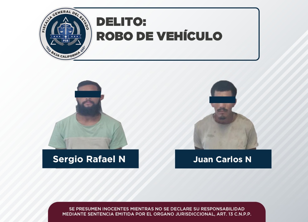 La Fiscalía Regional de Tecate, a través de los elementos de la Agencia Estatal de Investigación, cumplimentó dos órdenes de aprehensión por los delitos de robo equiparado de vehículo de motor en su modalidad de desmantelar vehículo robado y robo de vehículo de motor en la modalidad de posesión.