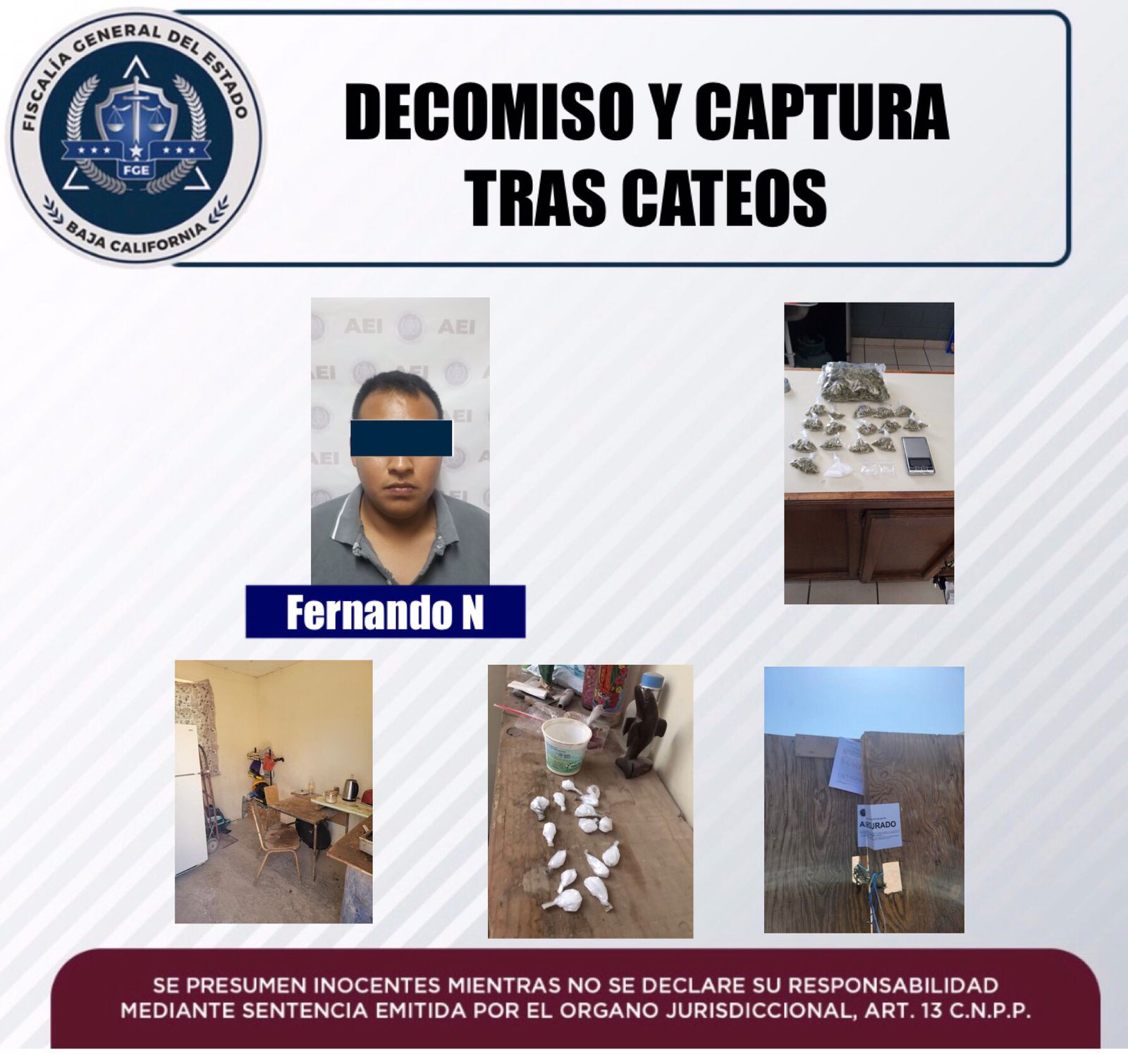 La Fiscalía General del Estado a través de las acciones de la Fiscalía Especializada en Narcomenudeo, en seguimiento a la investigación de denuncias anónimas, ejecutó dos cateos, logrando asegurar en uno de ellos a Fernando “N”, de 25 años de edad.