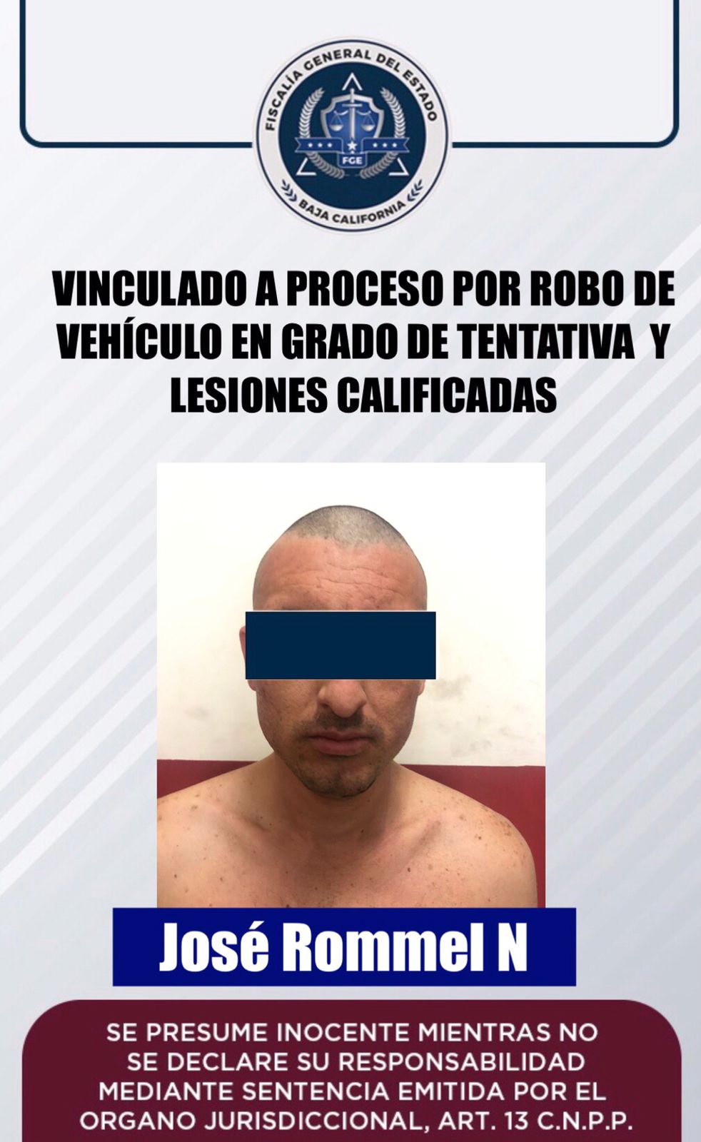La Fiscalía Regional de Mexicali, logró la vinculación a proceso penal en contra de José Rommel “N”, por el delito de robo de vehículo con violencia en grado de tentativa y lesiones calificadas.